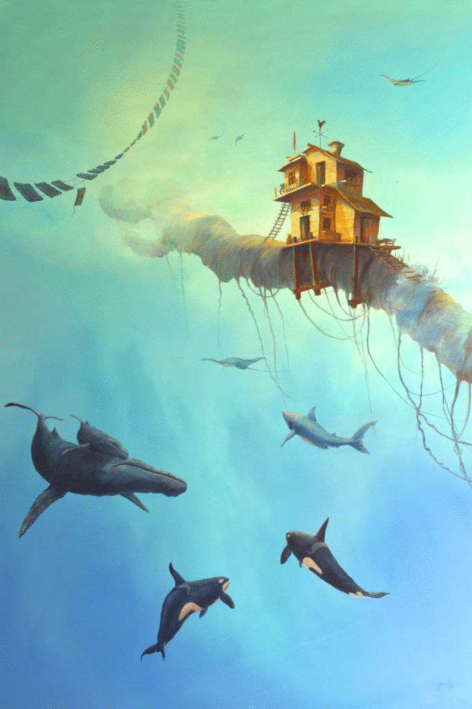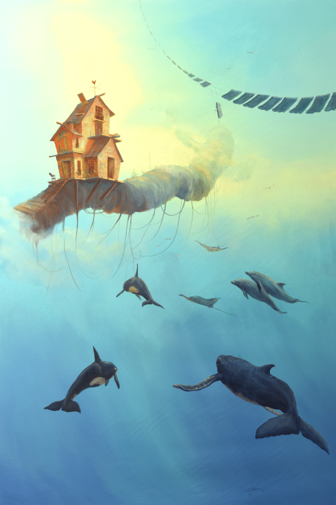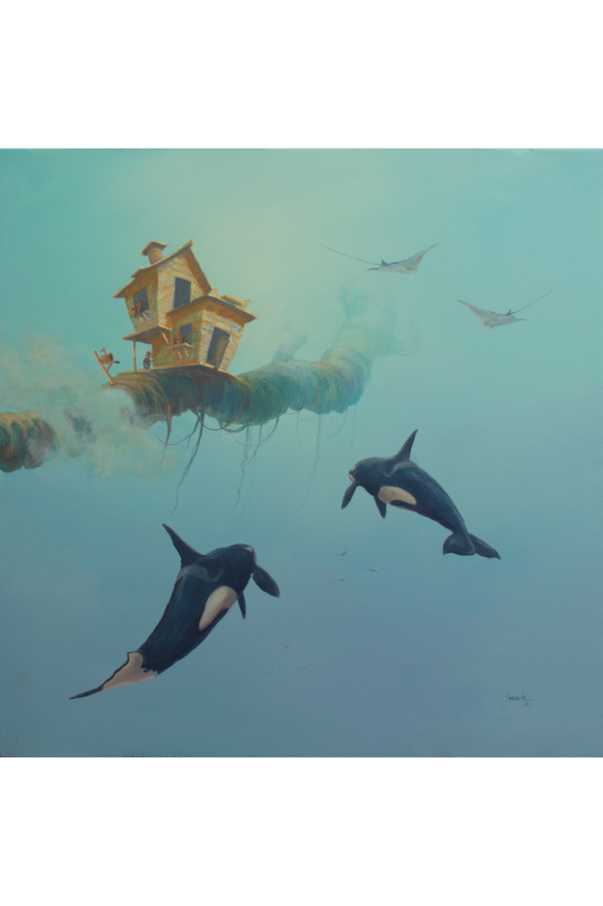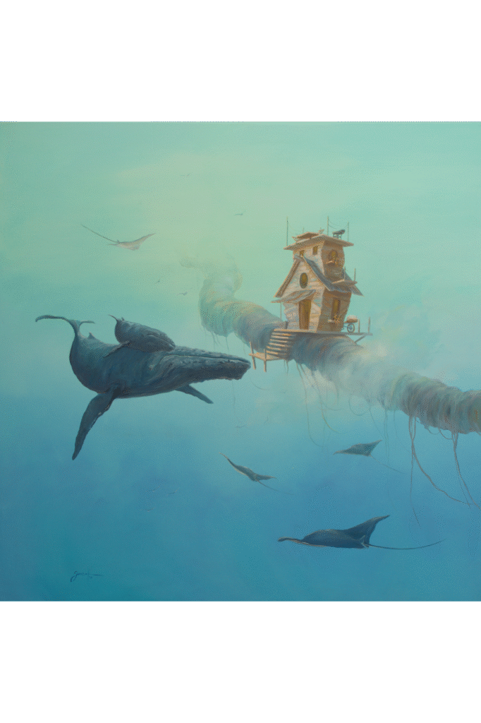 The mind is freed from physical boundaries. The little house, suspended high above, represents the inner center of the self. Below, wonder swim in a borderless blue—symbols of intelligence, playfulness, and expanded awareness. The scene dissolves the line between sky and sea, inviting us to understand that creative thought knows no fixed dimensions. Faith is the trunk from which the house emerges; it is the invisible force that sustains everything. The work suggests that imagination is as vast as the ocean.